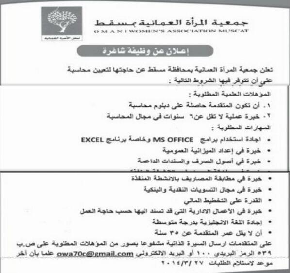 الثلاثاء 11 / 3 / 2014 - جمعية المراة العمانية (( مسقط )) - وظيفة شاغرة لـ محاسبة