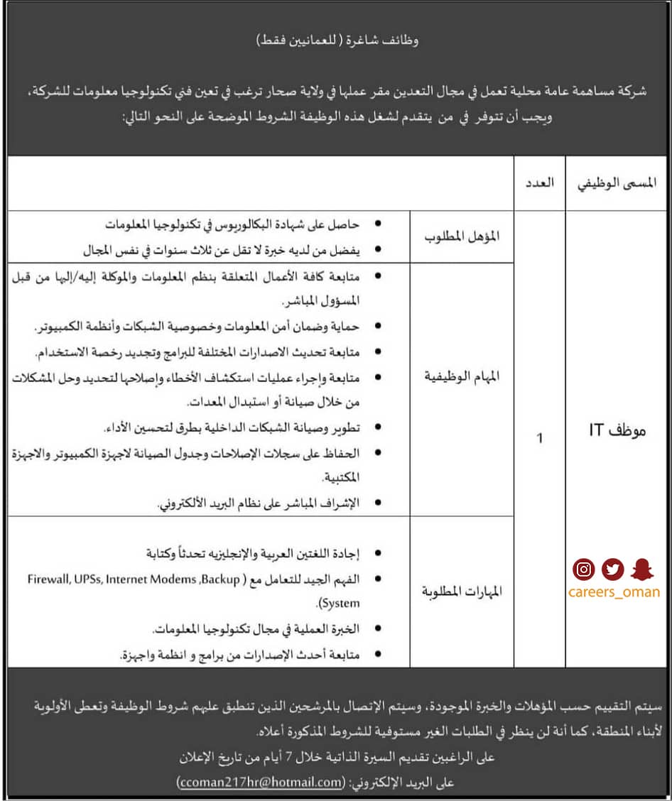 • الثلاثاء 16 / 3 / 2021 - شركة مساهمة عامة محلية في مجال التعدين - وظيفة شاغرة ( موظف IT )