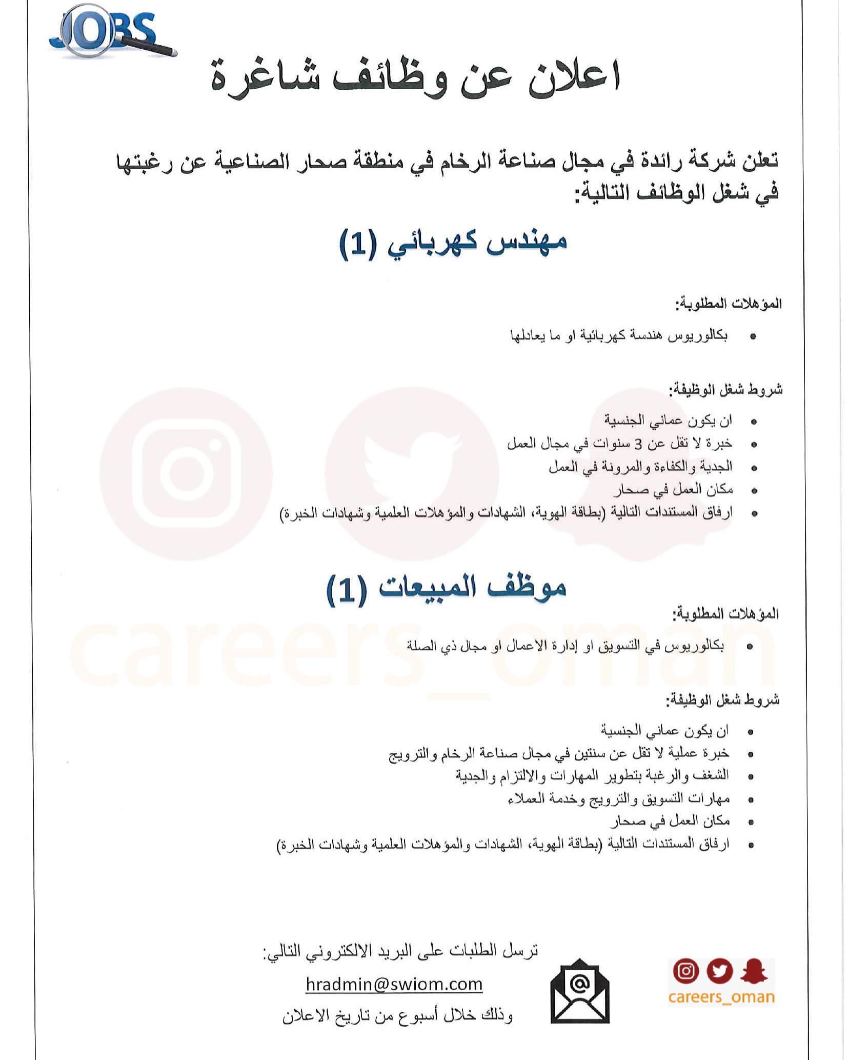 الموضوع: الثلاثاء 23 / 3 / 2021 - شركة رائدة في مجال صناعة الرخام في صحار - وظائف شاغرة ( مهندس كهربائي + موظف المبيعات )