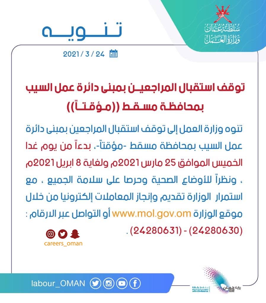 الموضوع: الاربعاء 24 / 3 / 2021 - وزارة العمل -تنويه توقف استقبال المراجعين بمنى دائرة عمل السيب بمسقط مؤقتاً