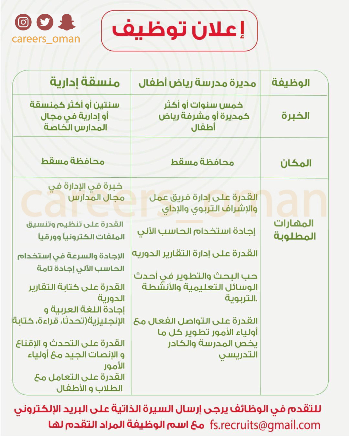 الموضوع: الخميس 25 / 3 / 2021 - مدرسة رياض اطفال في مسقط - وظائف شاغرة ( مديرة مدرسة + منسقة ادارية)