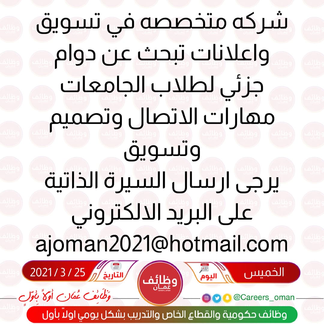 الموضوع: الخميس 25 / 3 / 2021 - شركه متخصصه في تسويق واعلانات في مسقط - وظيفة شاغرة بدوام جزئي