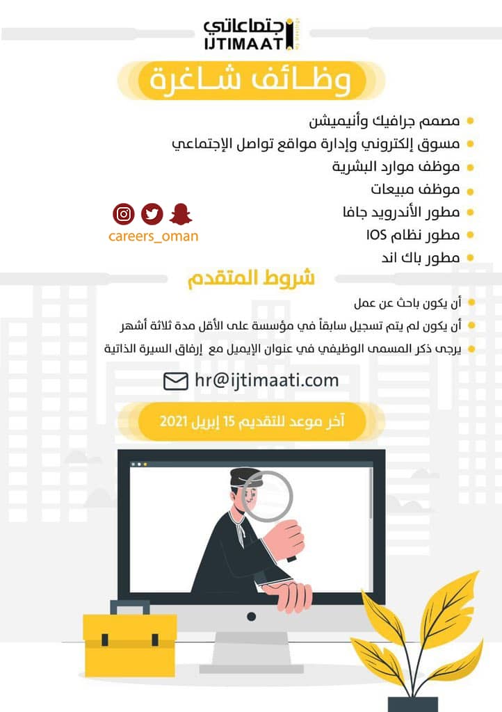 • الأحد 4 / 4 / 2021 - شركة إجتماعاتي - وظائف شاغرة