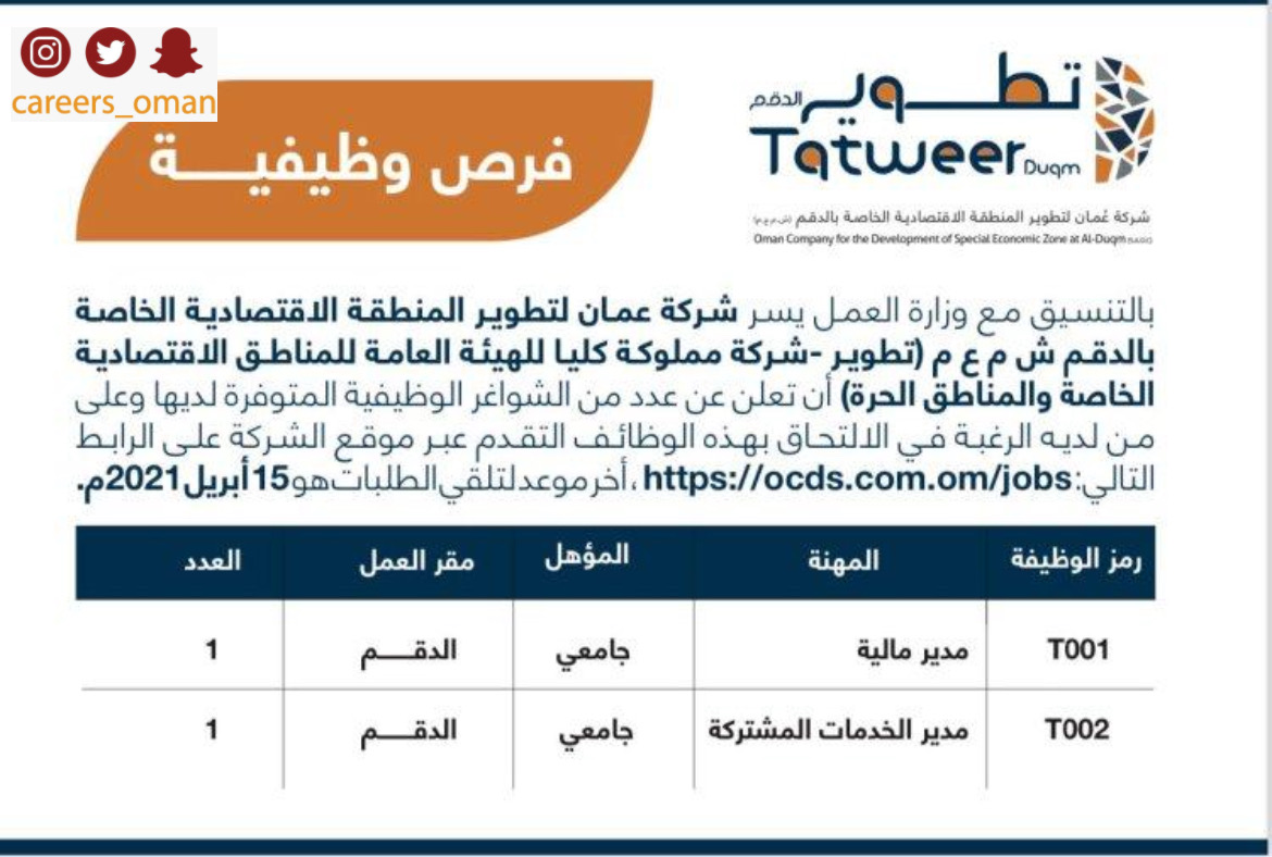 الموضوع: الإثنين 5 / 4 / 2021 - شركة عمان لتطوير المنطقة الاقتصادية الخاصة بالدقم - وظائف شاغرة