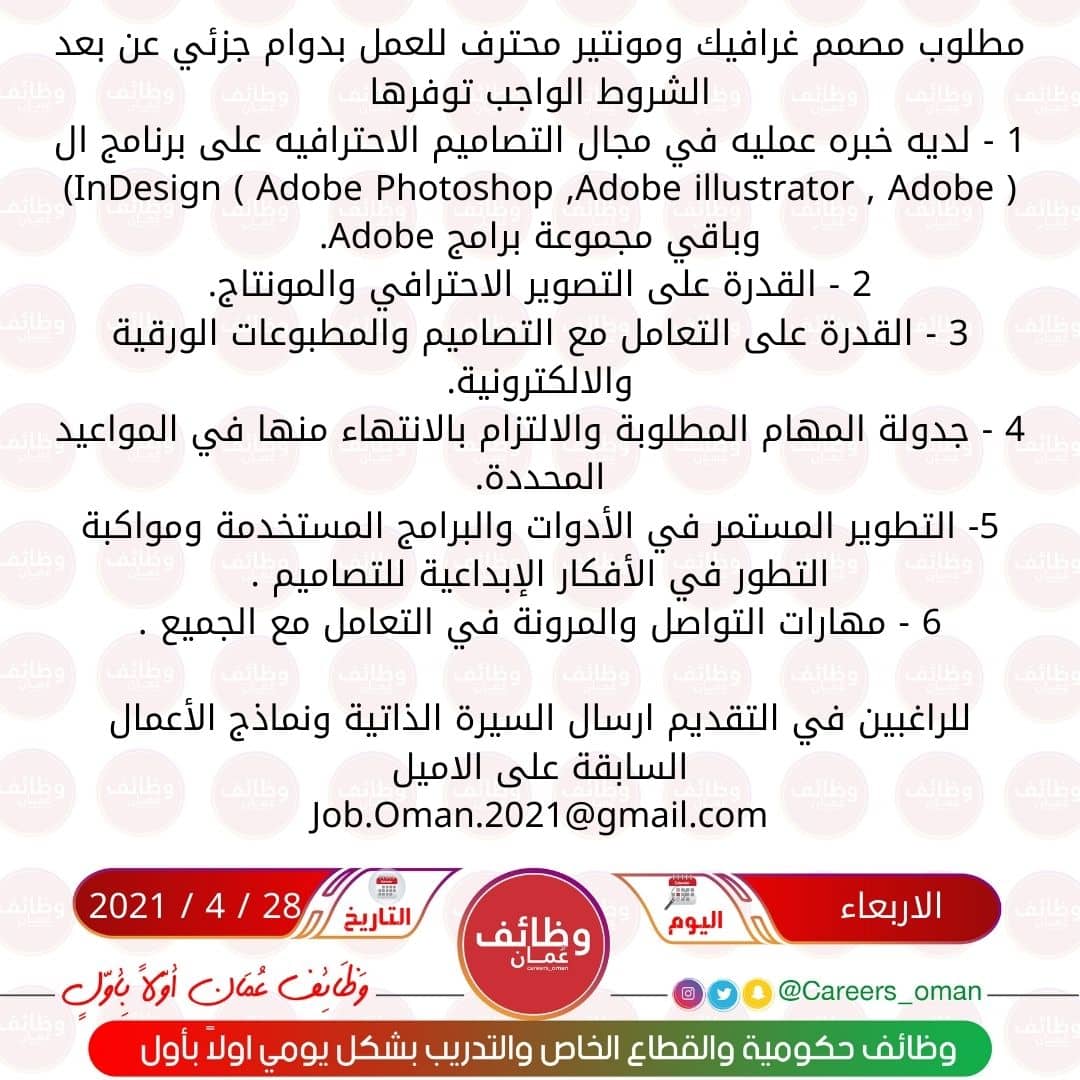 الموضوع: الاربعاء 28 / 4 / 2021 - شركة رائدة - وظيفة شاغرة ( مطلوب مصمم غرافيك ومونتير )