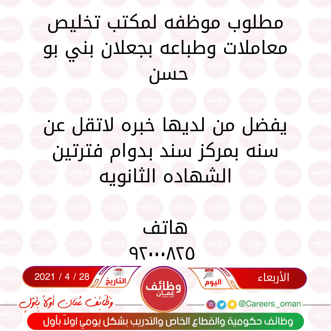الموضوع: الأربعاء 28 / 4 / 2021 - مكتب تخليص معاملات وطباعه بجعلان بني بو حسن - وظيفة شاغرة ( موظفة )