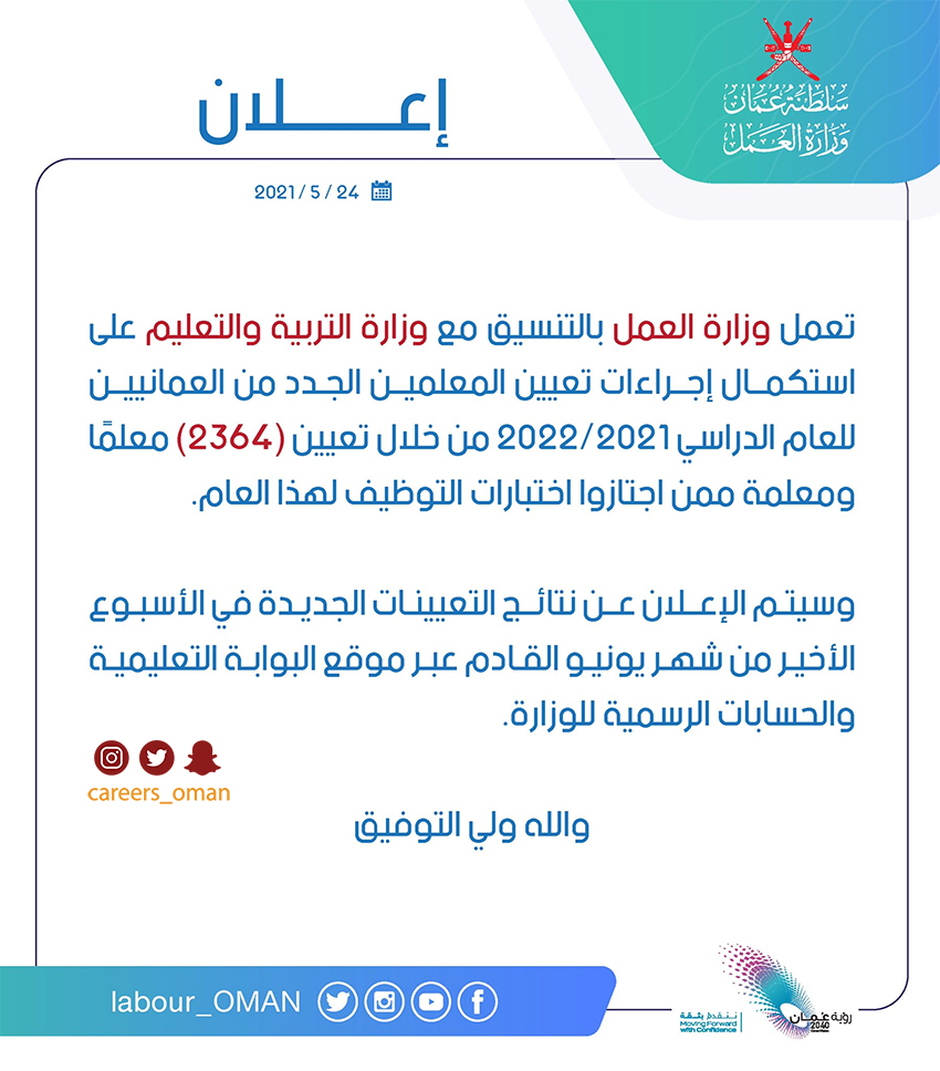 • الاثنين 24 / 5 / 2021 - وزارة العمل بالتنسيق مع وزارة التربية والتعليم - تعيين (2364) معلم ومعلمة ممن اجتازوا إختبارات