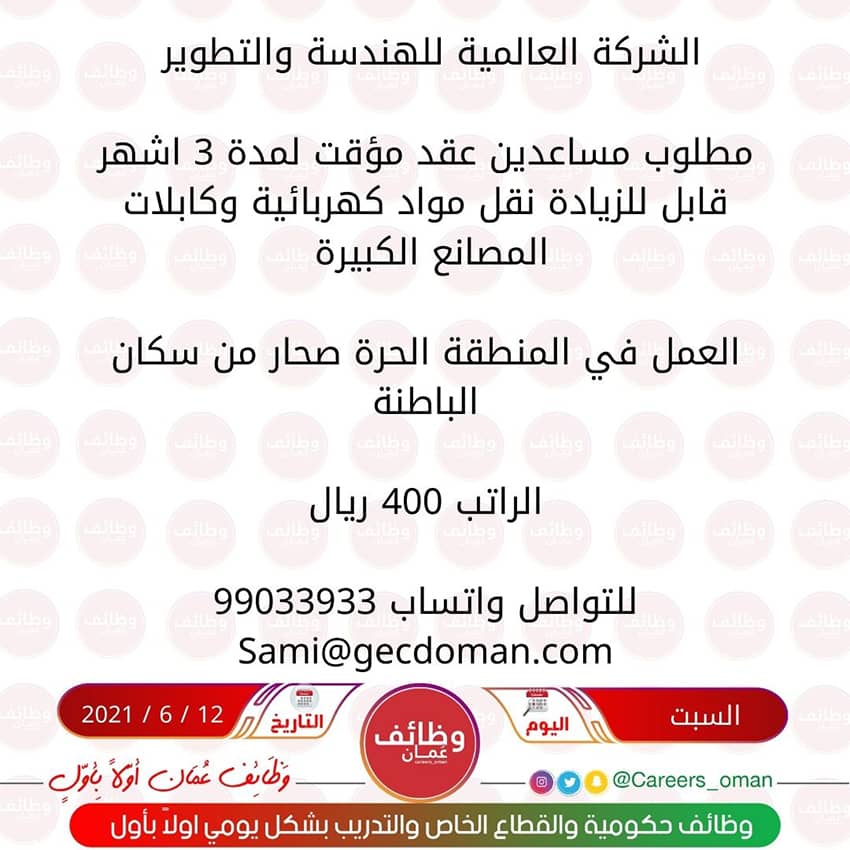 • السبت 12 / 6 / 2021 - الشركة العالمية للهندسة والتطوير - فرص عمل شاغرة ( مساعدين عقد مؤقت )