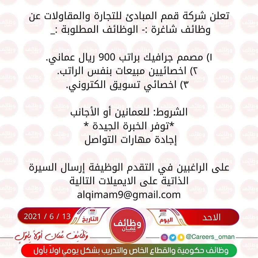 الموضوع: الأحد 13 / 6 / 2021 - شركة قمم المبادئ للتجارة والمقاولات - وظائف شاغرة