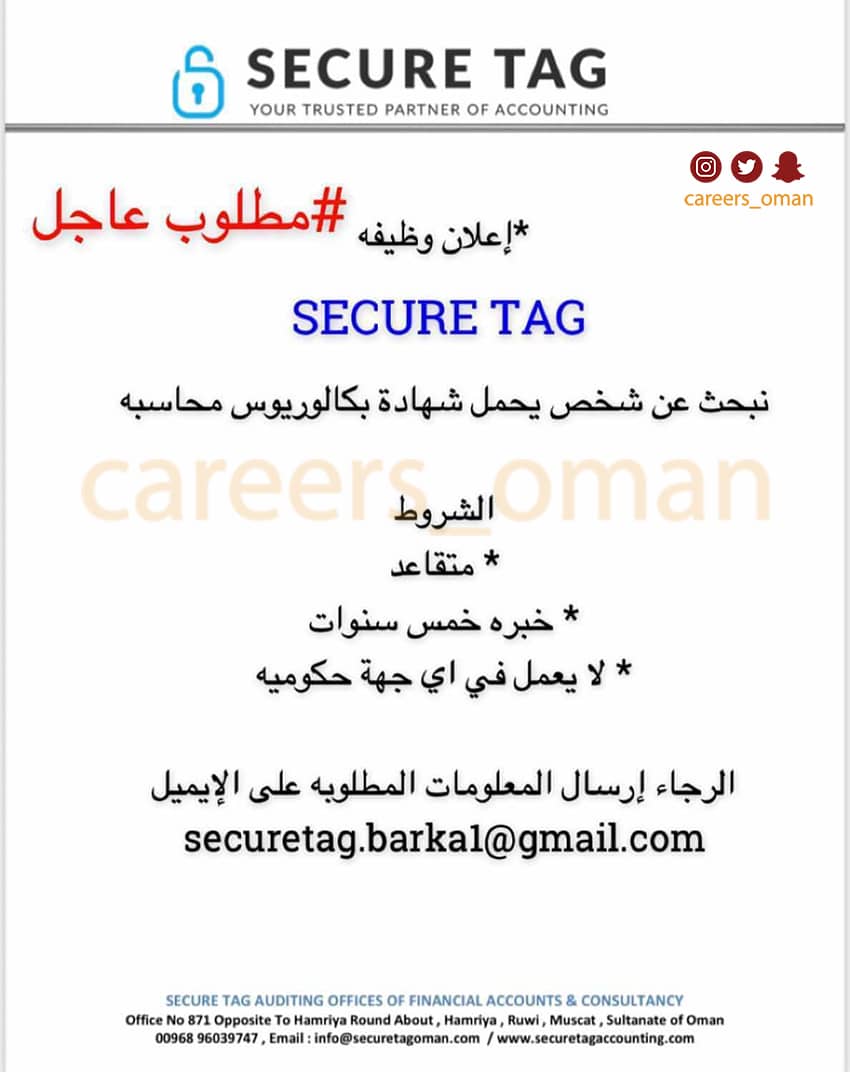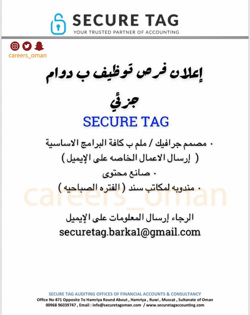 • الاحد 27 / 6 / 2021 - شركة Secure Tag - وظائف شاغرة ( محاسب + مصمم جرافيك )