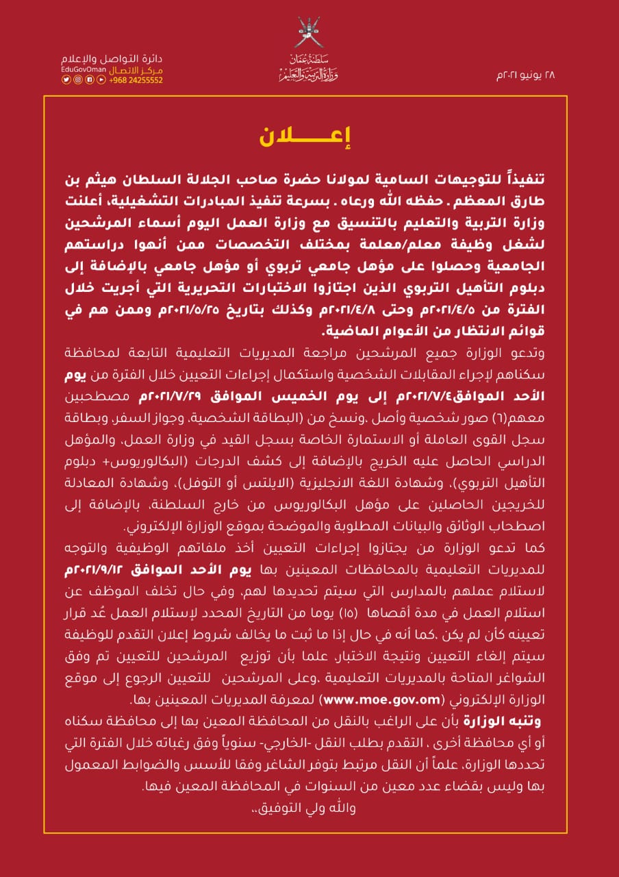 • الإثنين 28 / 6 / 2021 - وزارة التربية والتعليم - أسماء المرشحين للتعيين للعام الدراسي 2021/2022م
