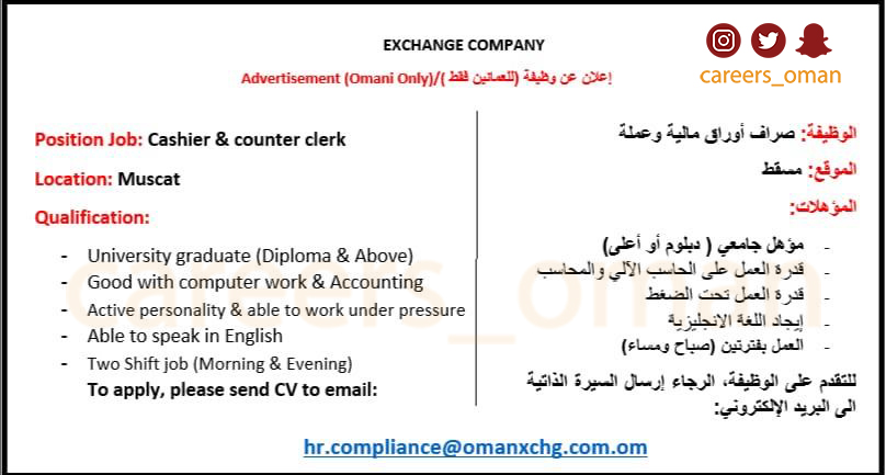 الموضوع: الثلاثاء 29 / 6 / 2021 - شركة صرافة في مسقط - وظيفة شاغرة ( صراف اوراق مالية وعملة )
