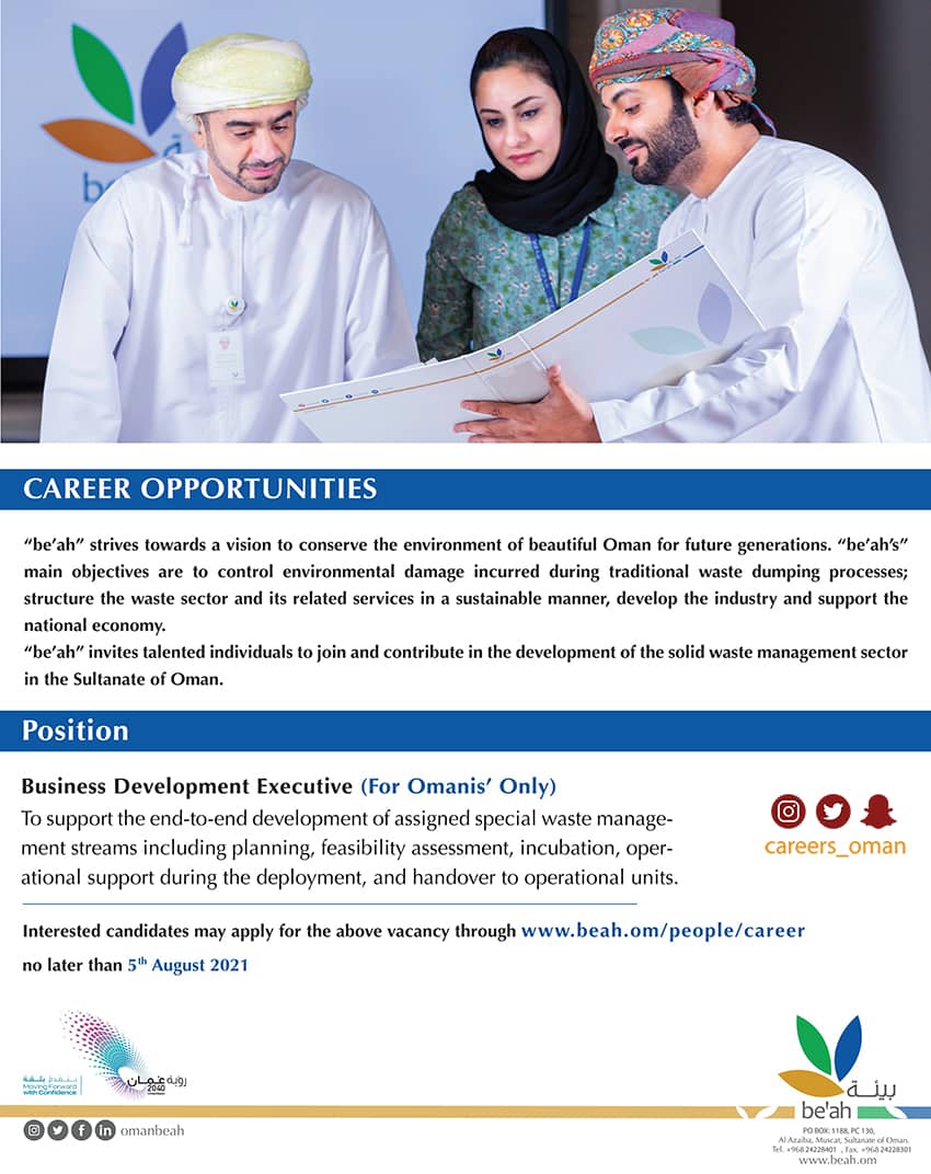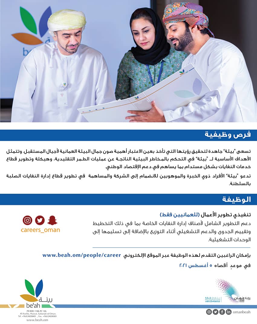 الموضوع: الاحد 1 / 8 / 2021 - الشركة العمانية القابضة لخدمات البيئة - وظيفة شاغرة ( تنفيذي تطوير الاعمال )