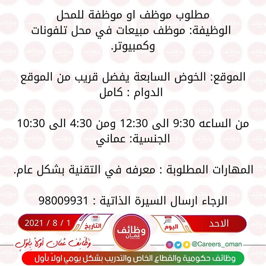 • الاحد 1 / 8 / 2021 - محل تلفونات وكمبيوتر في الخوض السابعة - وظيفة شاغرة ( موظف او موظفة مبيعات )