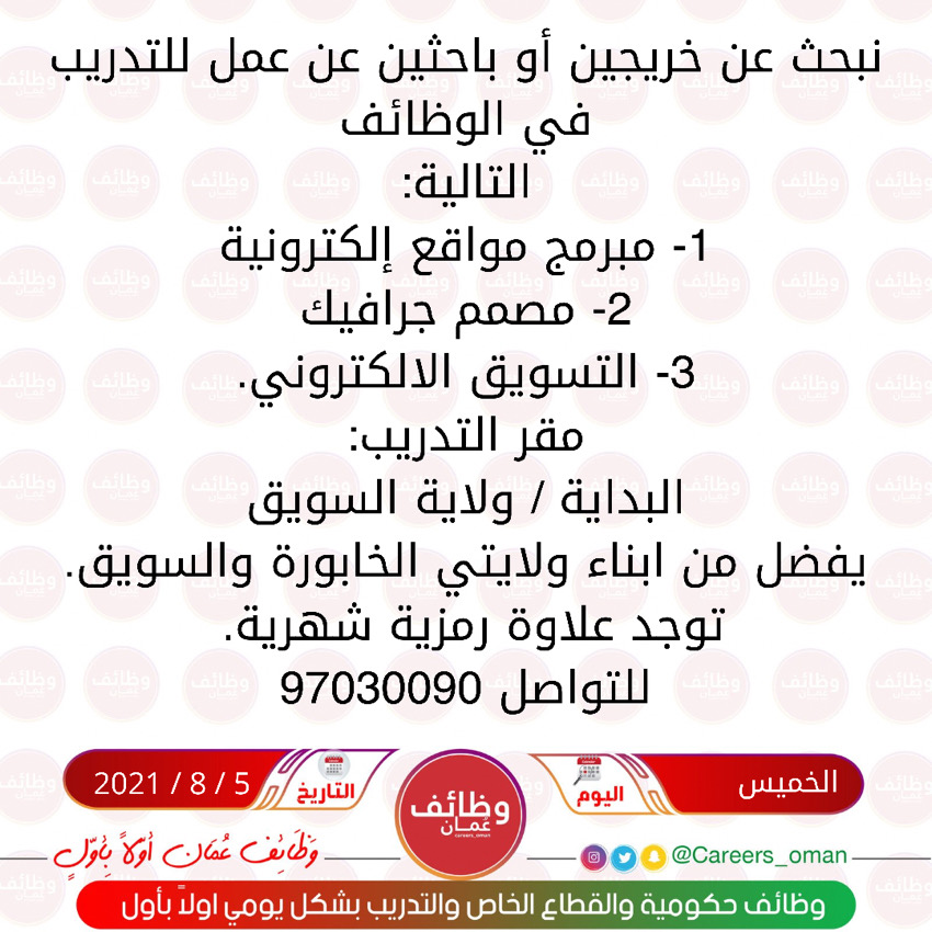 الخميس 5 / 8 / 2021 - شركة رائدة في السويق - فرص تدريب شاغرة + علاوة شهرية
