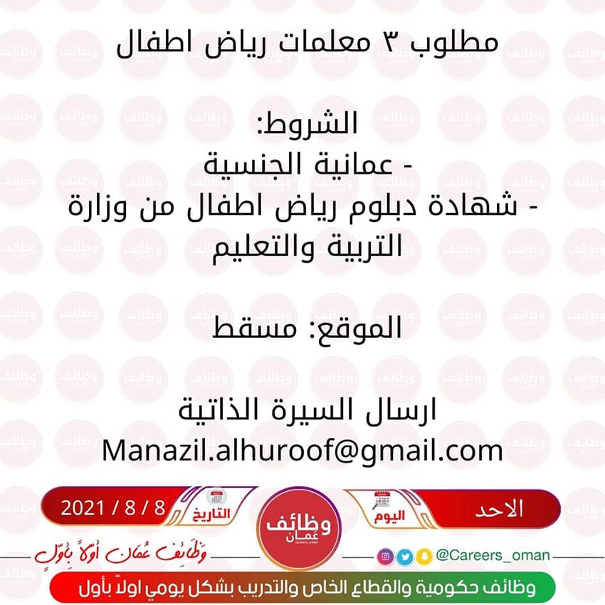 • الاحد 8 / 8 / 2021 - مدرسة رائدة في مسقط - فرص عمل شاغرة ( معلمات رياض اطفال العدد 3 )