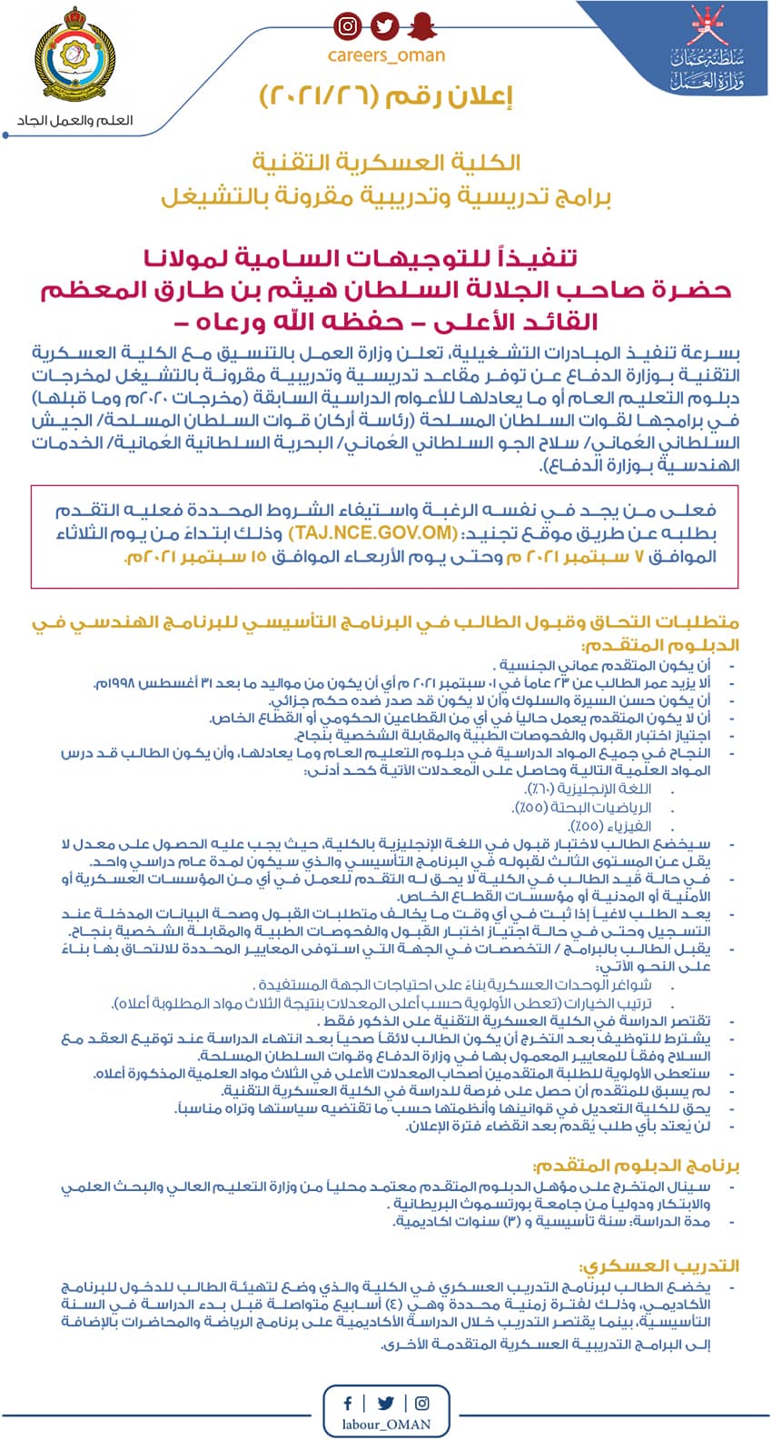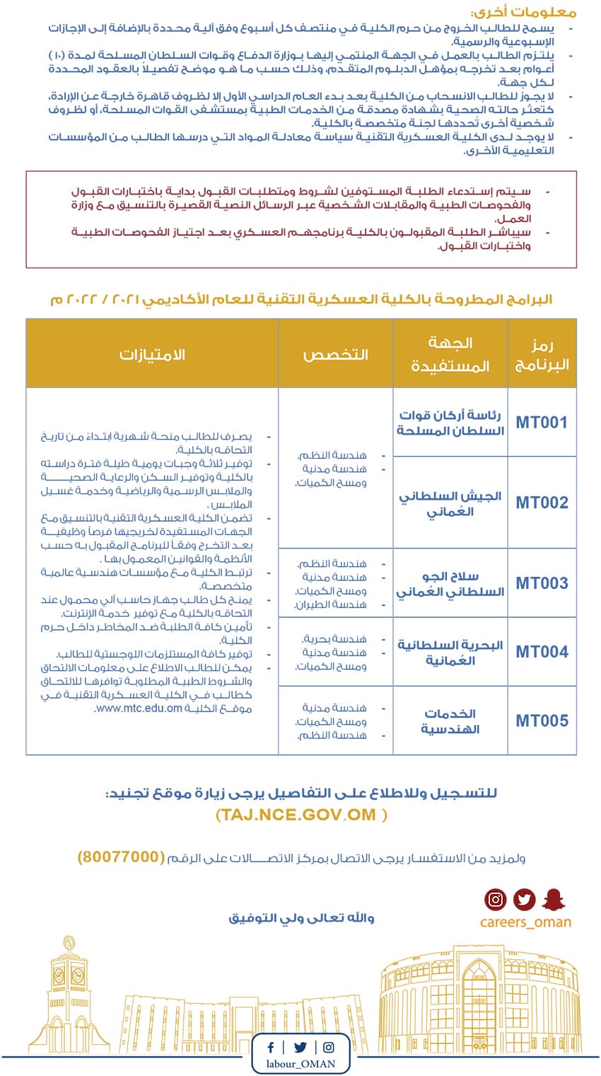 للتسجيل عبر الموقع الالكتروني للوزارة (تجنيد): https://taj.nce.gov.om/