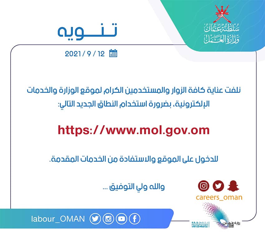 للدخول على الموقع والاستفادة من الخدمات المقدمة. https://www.mol.gov.om/