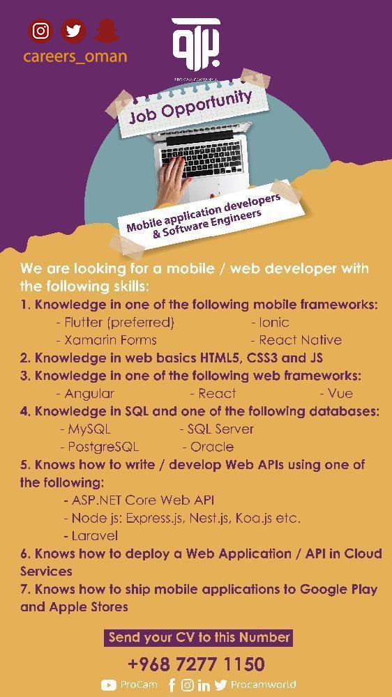 • الاحد 12 / 9 / 2021 - عالم بروكام - وظيفة شاغرة ( مطور ويب والتطبيقات )