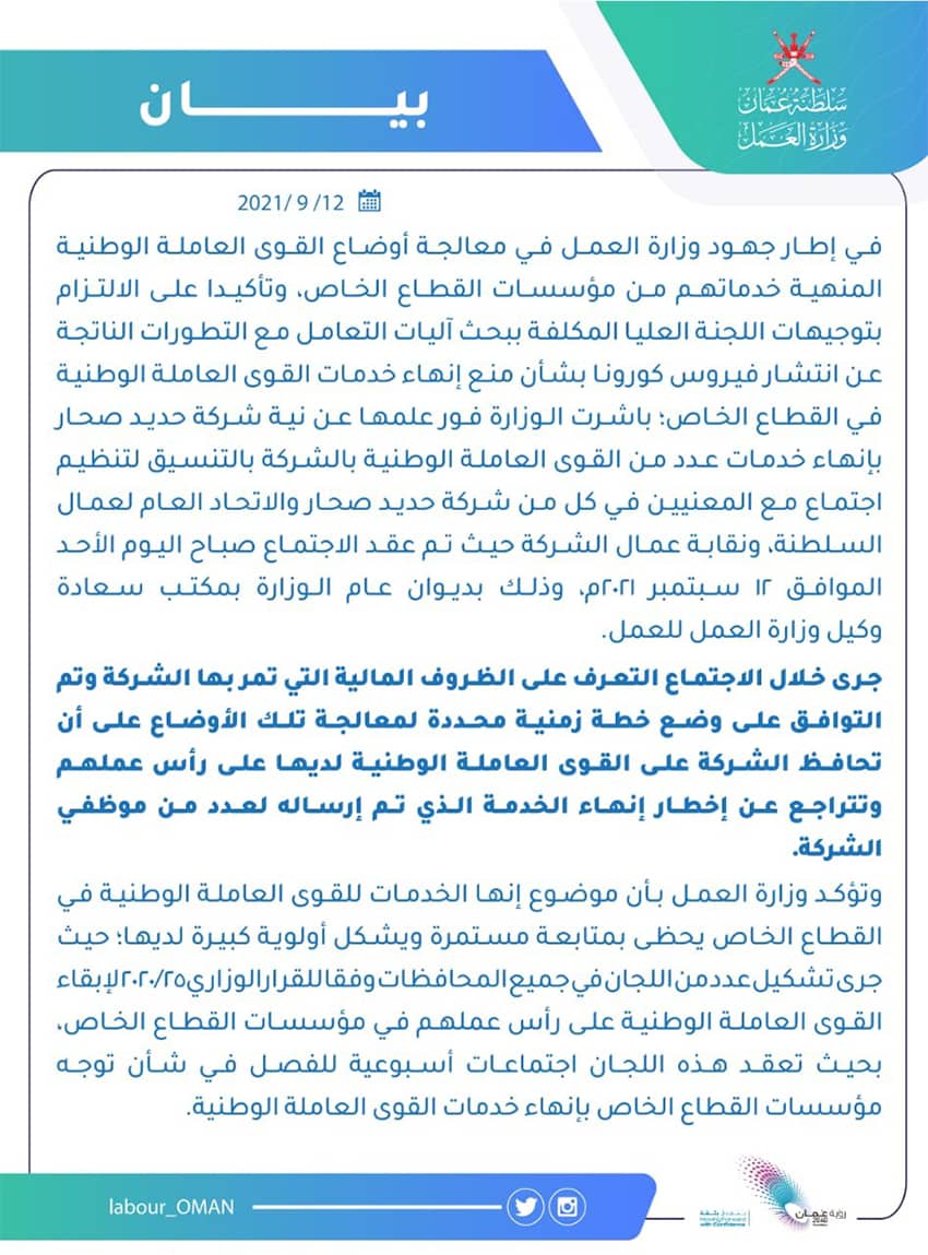 الموضوع: الاحد 12 / 9 / 2021 - وزارة العمل - بيان ( التراجع عن إخطار إنهاء العمل المرسل لعدد من موظفي شركة حديد صحار )