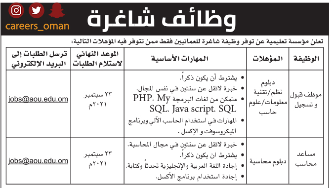 • السبت 18 / 9 / 2021 - مؤسسة تعليمية - وظائف شاغرة ( موظف قبول وتسجيل + مساعد محاسب )