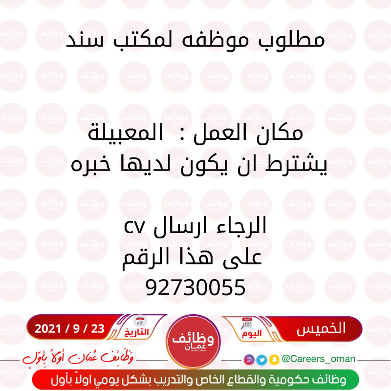 • الخميس 23 / 9 / 2021 - مكتب سند في المعبيلة - وظيفة شاغرة ( مطلوب موظفة )