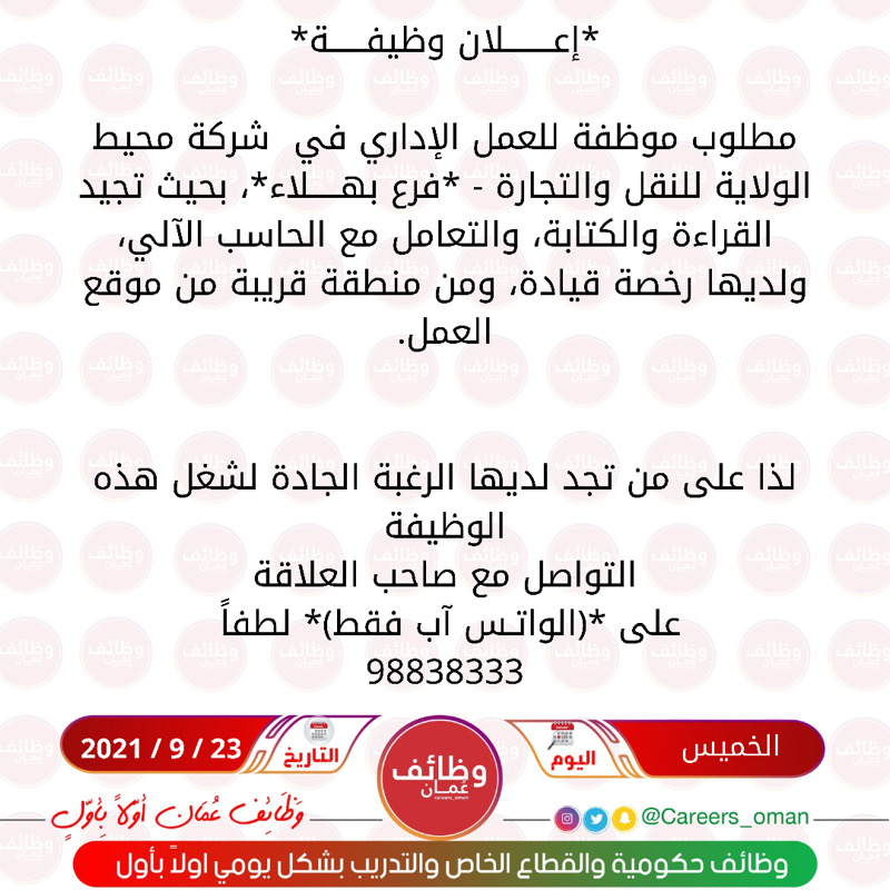 الموضوع: الخميس 23 / 9 / 2021 - شركة محيط الولاية للنقل والتجارة فرع بهلاء -وظيفة شاغرة ( موظفة ادارية )