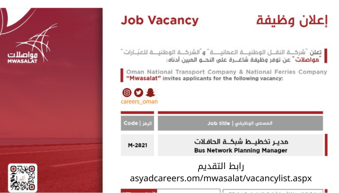 رابط التقديم https://asyadcareers.om/mwasalat/vacancylist.aspx