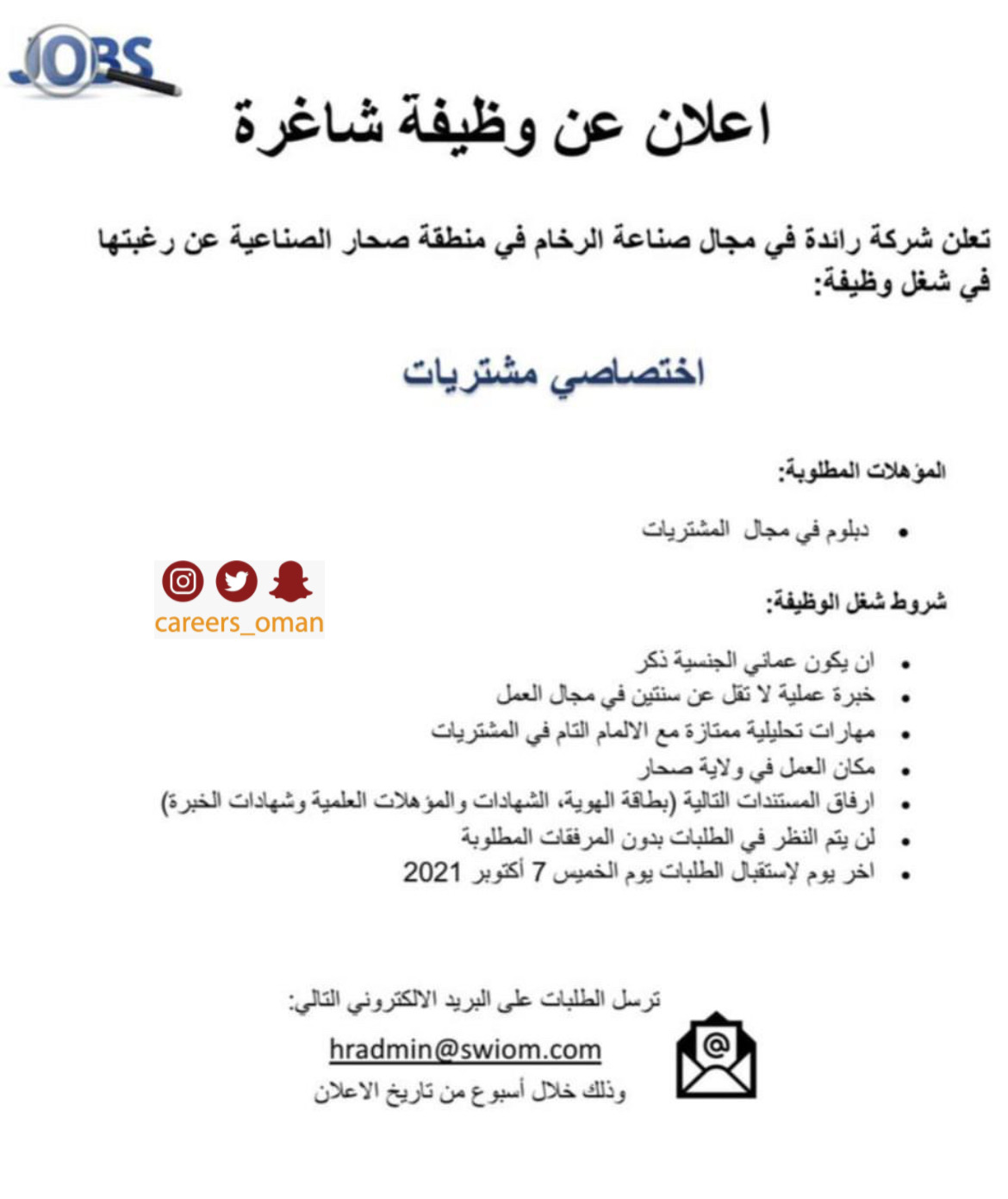 الموضوع: الاربعاء 29 / 9 / 2021 - شركة رائدة في مجال صناعة الرخام في صحار - وظيفة شاغرة ( إختصاصي مشتريات )