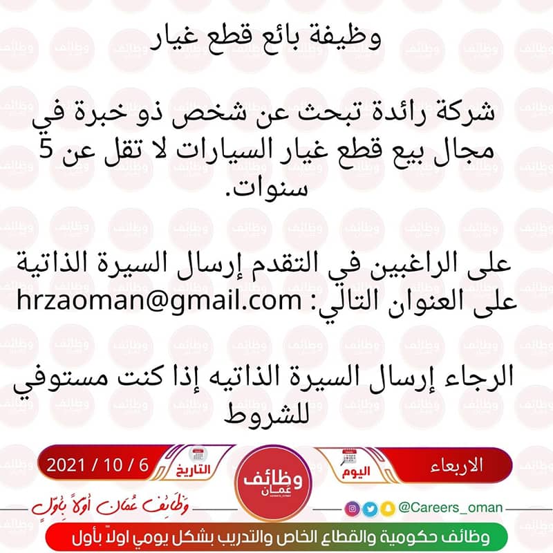 الموضوع: الأربعاء 6 / 10 / 2021 - شركة رائدة - وظيفة شاغرة ( بائع قطع غيار )