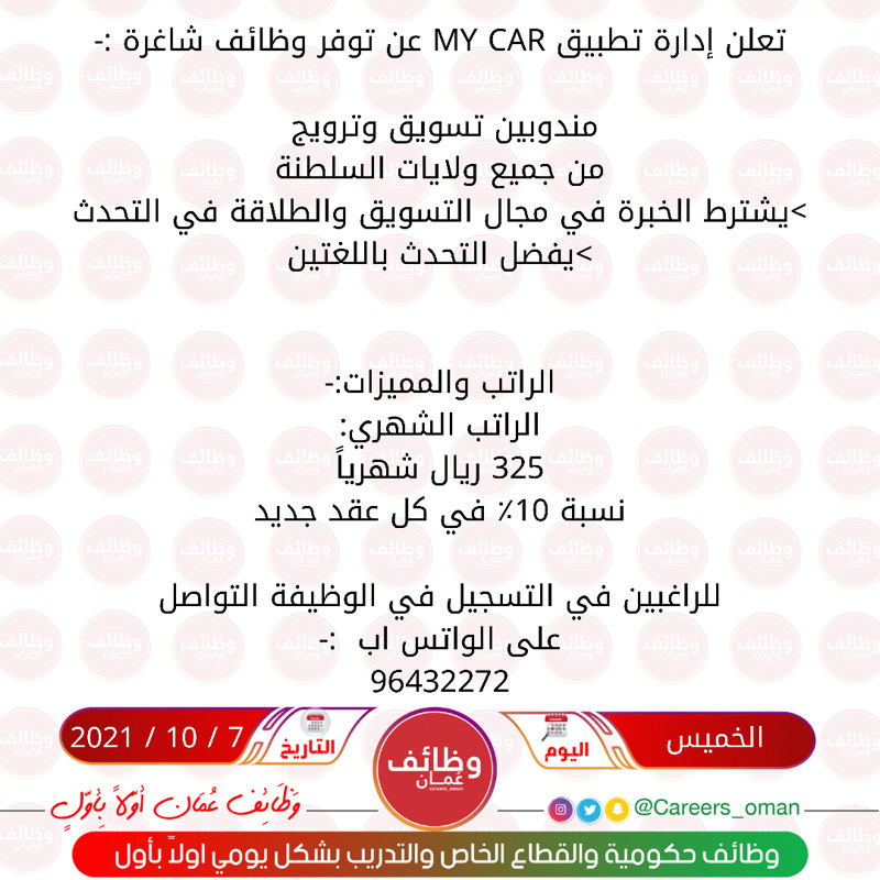 الخميس 7 / 10 / 2021 - تطبيق MY CAR - فرص عمل شاغرة ( مندوبين تسويق وترويج )