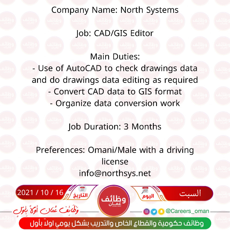 الموضوع: السبت 16 / 10 / 2021 - شركة North Systems - وظيفة شاغرة ( CAD/GIS Editor )