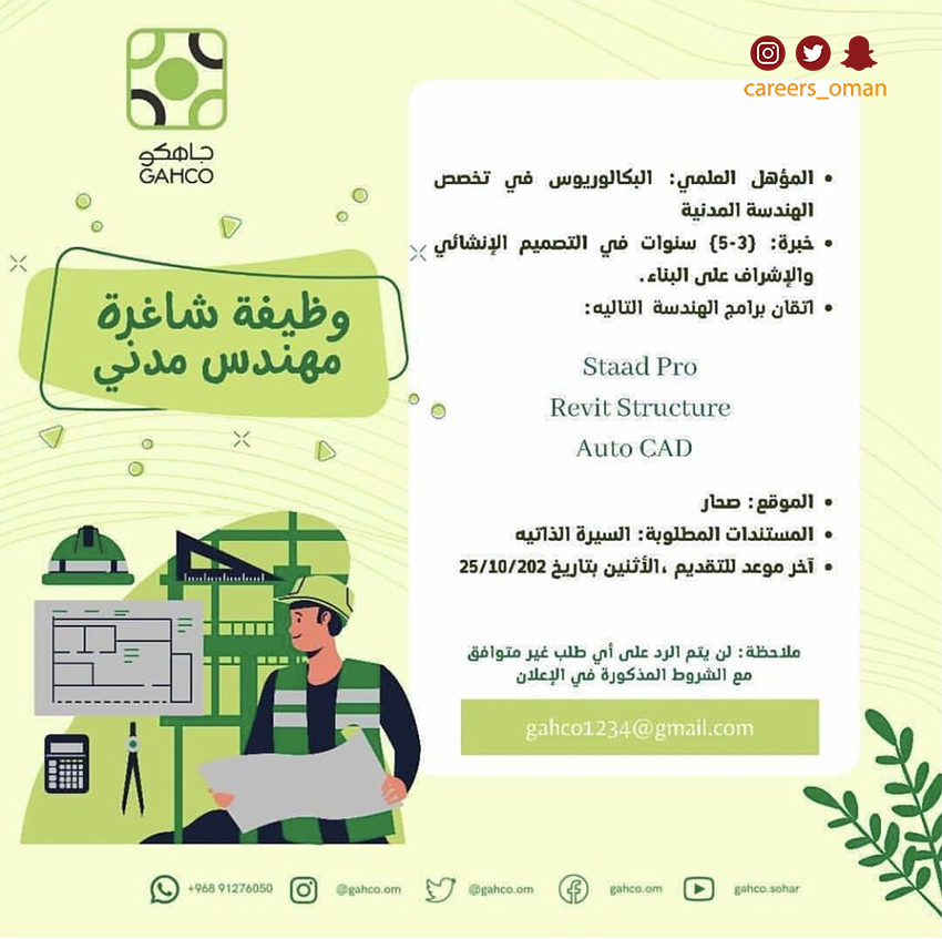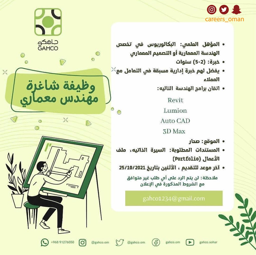 الموضوع: الثلاثاء 19 / 10 / 2021 - مكتب جاهكو للإستشارات الهندسية في صحار - وظيفتين شاغرتين ( مهندس مدني / مهندس معماري )