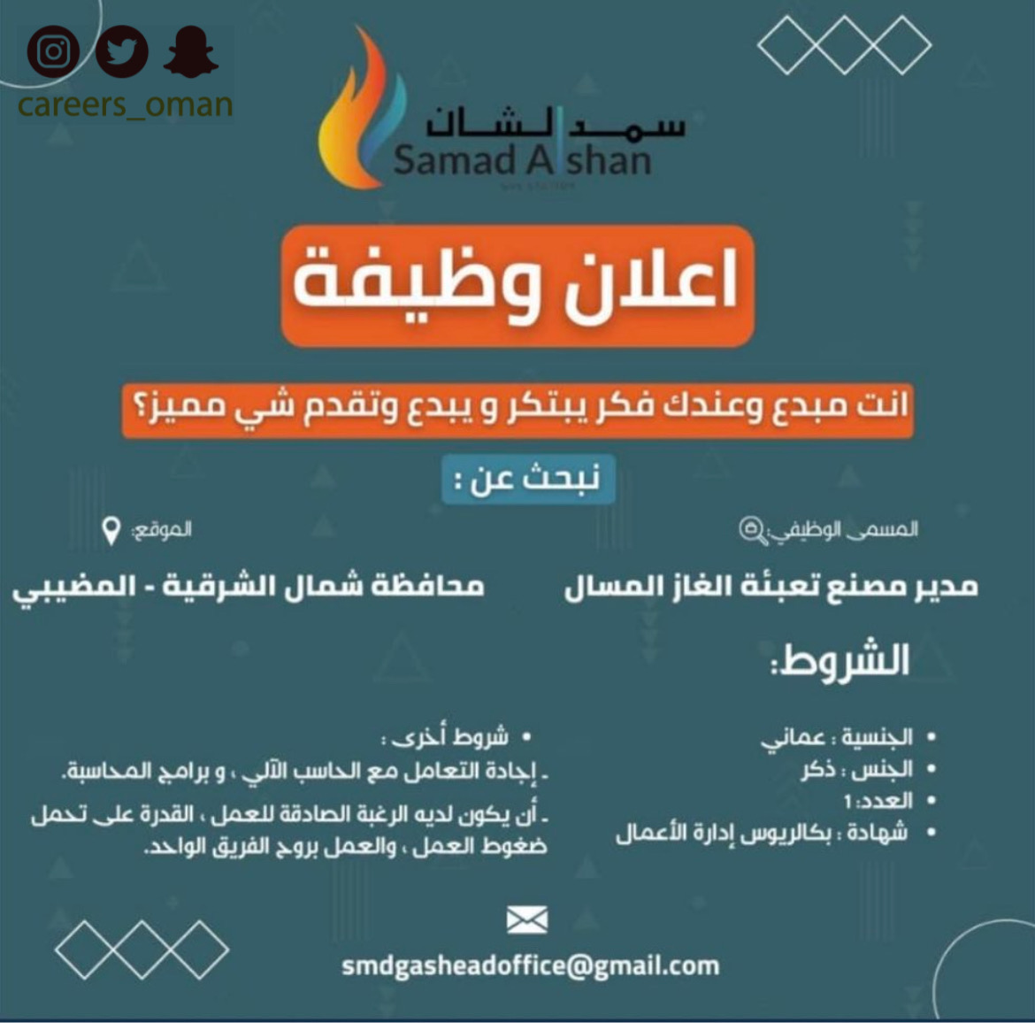 • السبت 23 / 10 / 2021 - شركة سمد الشان للغاز المسال -وظيفة شاغرة ( مدير مصنع تعبئة الغاز المسال )