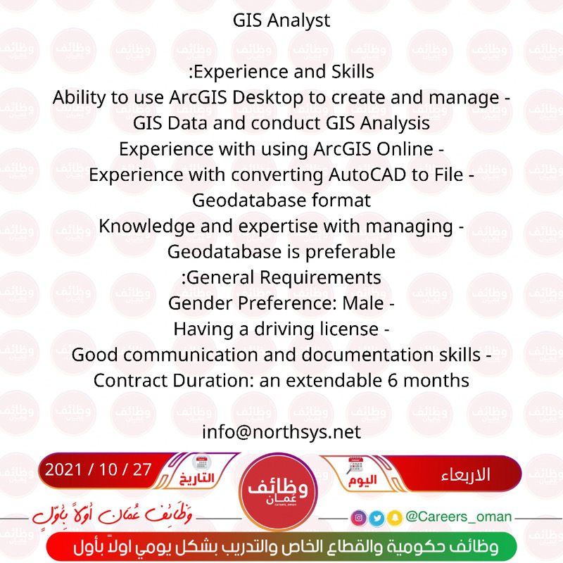 الموضوع: الاربعاء 27 / 10 / 2021 - شركة رائدة - وظيفة شاغرة بعقد مؤقت ( GIS Analyst )