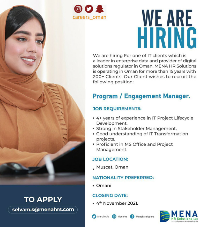 • السبت 30 / 10 / 2021 - شركة الشرق الأوسط لحلول الموارد البشرية - وظيفة شاغرة ( ‏Program /Engagement Manager )