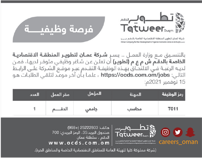 • السبت 6 / 11 / 2021 - شركة عمان لتطوير المنطقة الاقتصادية الخاصة بالدقم - وظيفة شاغرة ( محاسب )