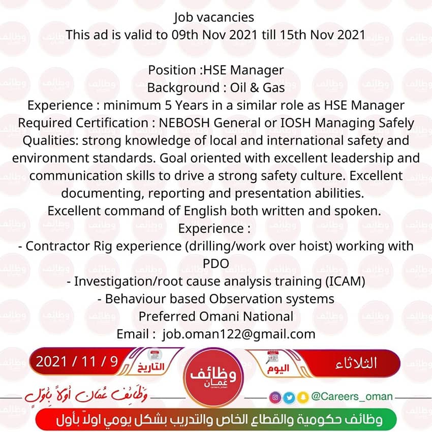 الثلاثاء 9 / 11 / 2021 - شركة رائدة - وظيفة شاغرة ( HSE Manager )
