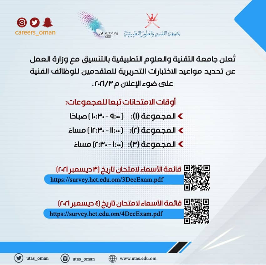 تعلن الجامعة التقنية والعلوم التطبيقية بالتنسيق مع وزارة العمل عن تحديد مواعيد الاختبارات التحريرية للمتقدمين للوظائف الفنية وفقا للإعلان م 2021/3