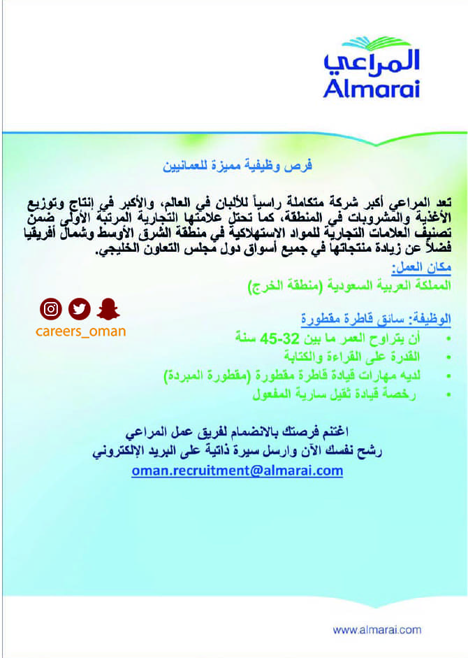 الموضوع: الاحد 5 / 12 / 2021 - شركة المراعي - فرص وظيفية للعمانيين ( سائق قاطرة مقطورة )
