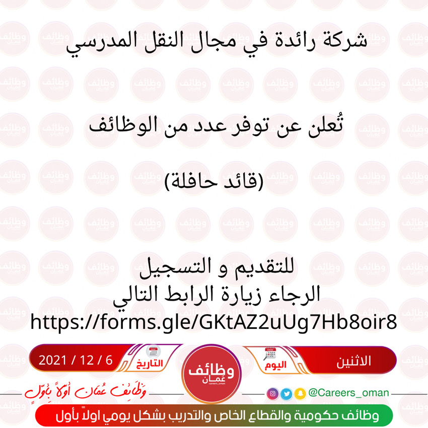 انستجرام : careers__oman تويتر : careers_oman قناة على التلجرام : careers_oman الفيس بوك: careersoman سناب شات : careers_oman تابع جديد الوظائف على أخبار جوجل https://news.google.com/s/CBIwpO6O2q...ar&sceid=OM:ar