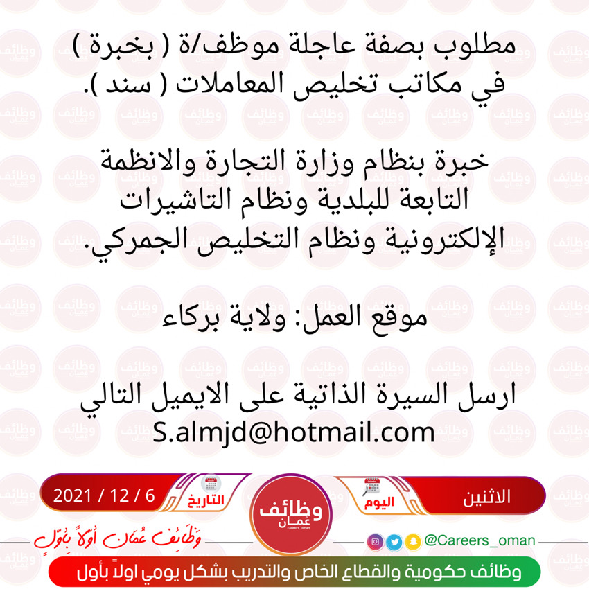 الموضوع: الاثنين 6 / 12 / 2021 - مكتب سند في بركاء - وظيفة شاغرة ( موظف/ـة )