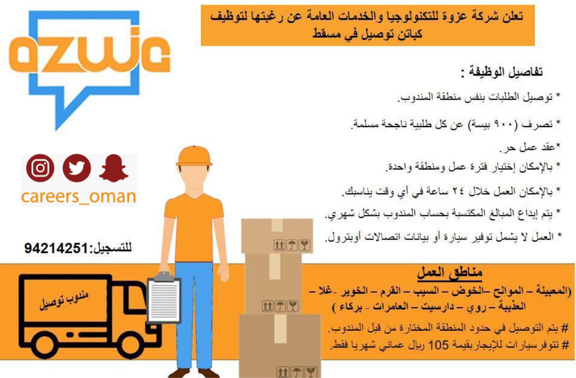 الموضوع: الثلاثاء 14 / 12 / 2021 - شركة عزوة للتكنولوجيا والخدمات العامة - فرص عمل شاغرة ( كباتن توصيل في مسقط )