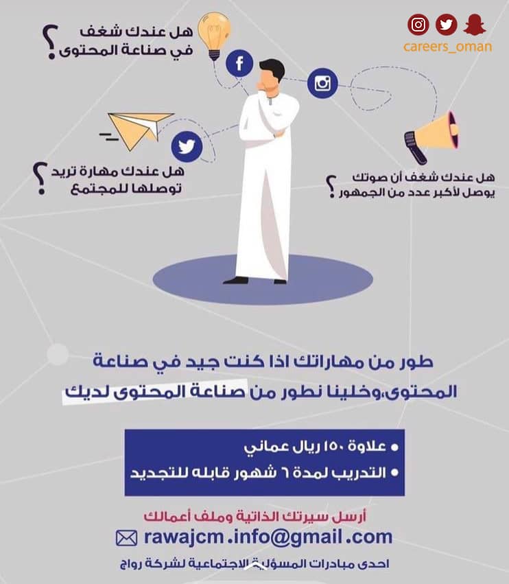 • الاربعاء 15 / 12 / 2021 - شركة رواج للتسويق - توفر فرصة تدريبية كصانع محتوى ( علاوة تدريبية 150 ريال )