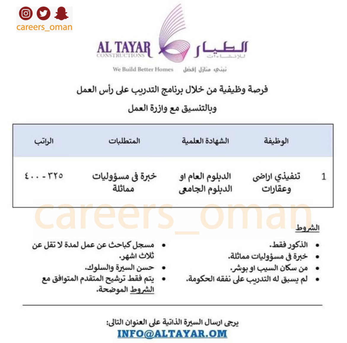 الاحد 26 / 12 / 2021 - الطيار للانشاءات - وظيفة شاغرة ( تنفيذي أراضي وعقارات تدريب على رأس العمل )