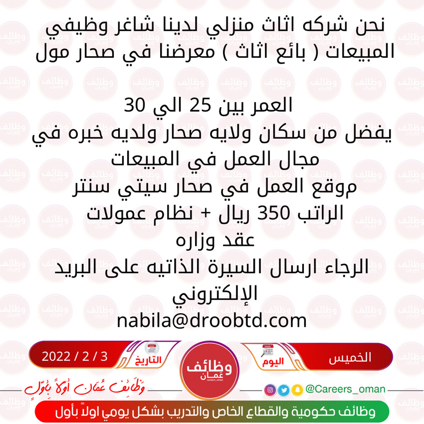الموضوع: الخميس 3 / 2 / 2022 - شركه اثاث منزلي في صحار - وظيفة شاغرة ( بائع اثاث )