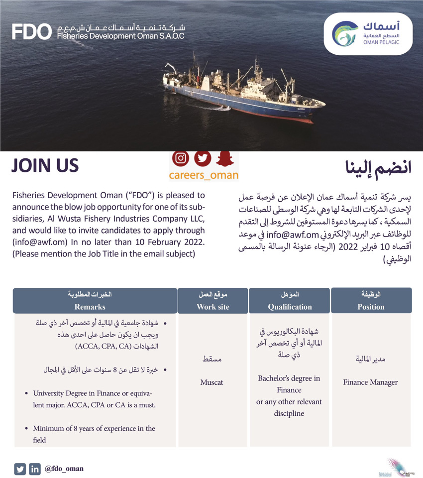 الموضوع: الخميس 3 / 2 / 2022 - شركة تنمية أسماك عمان - وظيفة شاغرة ( مدير المالية )