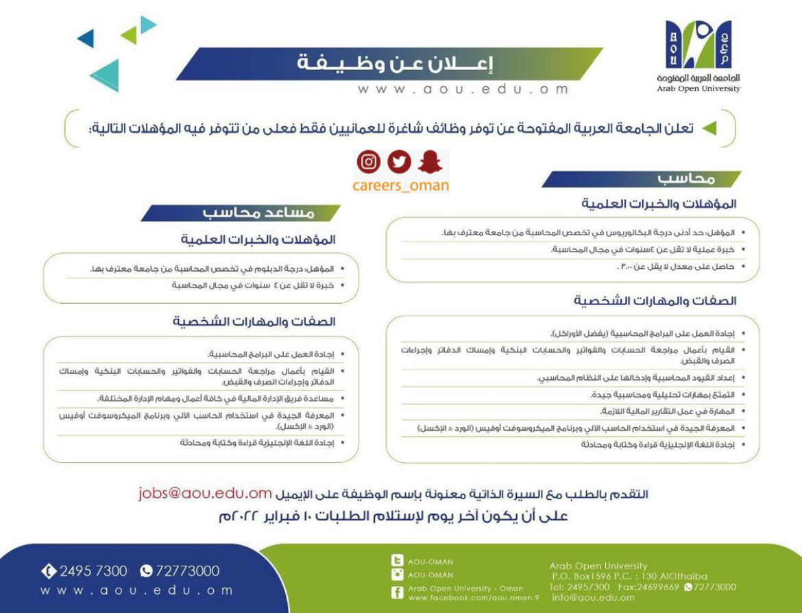 • الخميس 3 / 2 / 2022 - الجامعة العربية المفتوحة - وظائف شاغرة ( محاسب + مساعد محاسب )