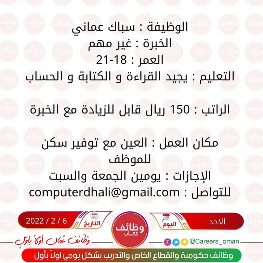 الاحد 6 / 2 / 2022 - شركة رائدة في العين - وظيفة شاغرة ( سباك عماني )