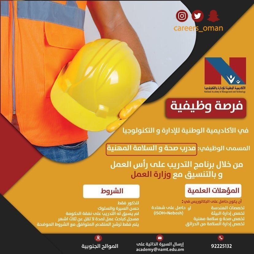 الموضوع: الخميس 10 / 2 / 2022 - الأكاديمية الوطنية للإدارة والتكنولوجيا - فرص وظيفية شاغرة ( مدرب صحة والسلامة المهنية )